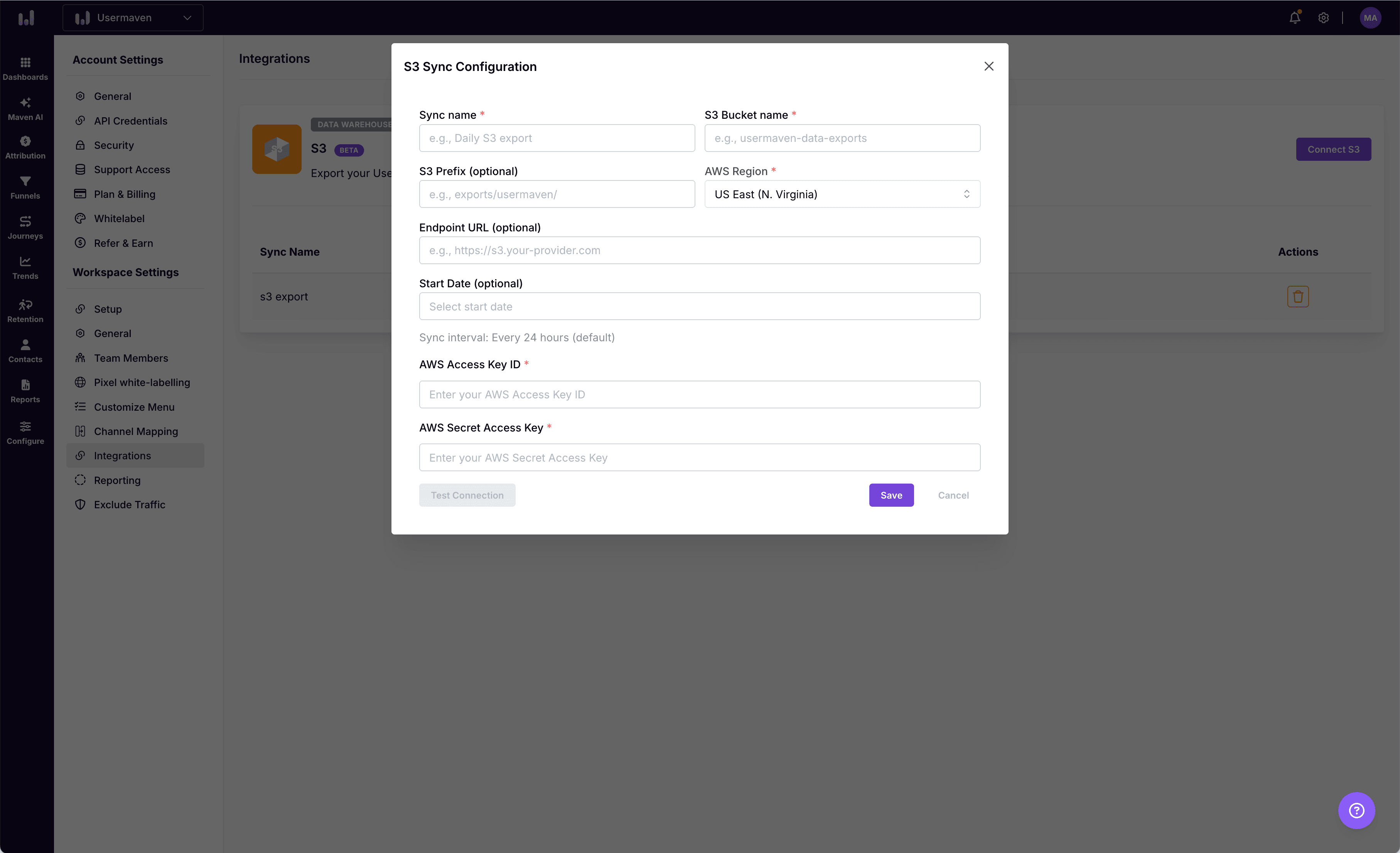 This guide will walk you through the process of setting up S3 exports for your Usermaven workspace. Usermaven can deliver batched exports of your ClickHouse events directly into an S3 bucket or any S3-compatible object storage that you control. Each export contains only the rows that are new since the previous delivery, ensuring incremental updates without duplicates.